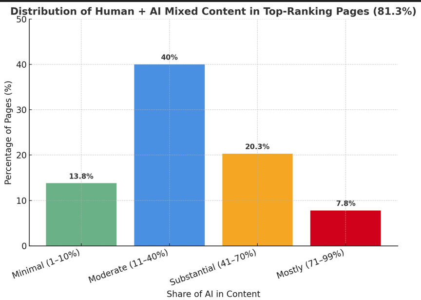 Here’s the nuance: while AI doesn’t hurt rankings, the very top results (#1 positions) skew toward less pure AI.